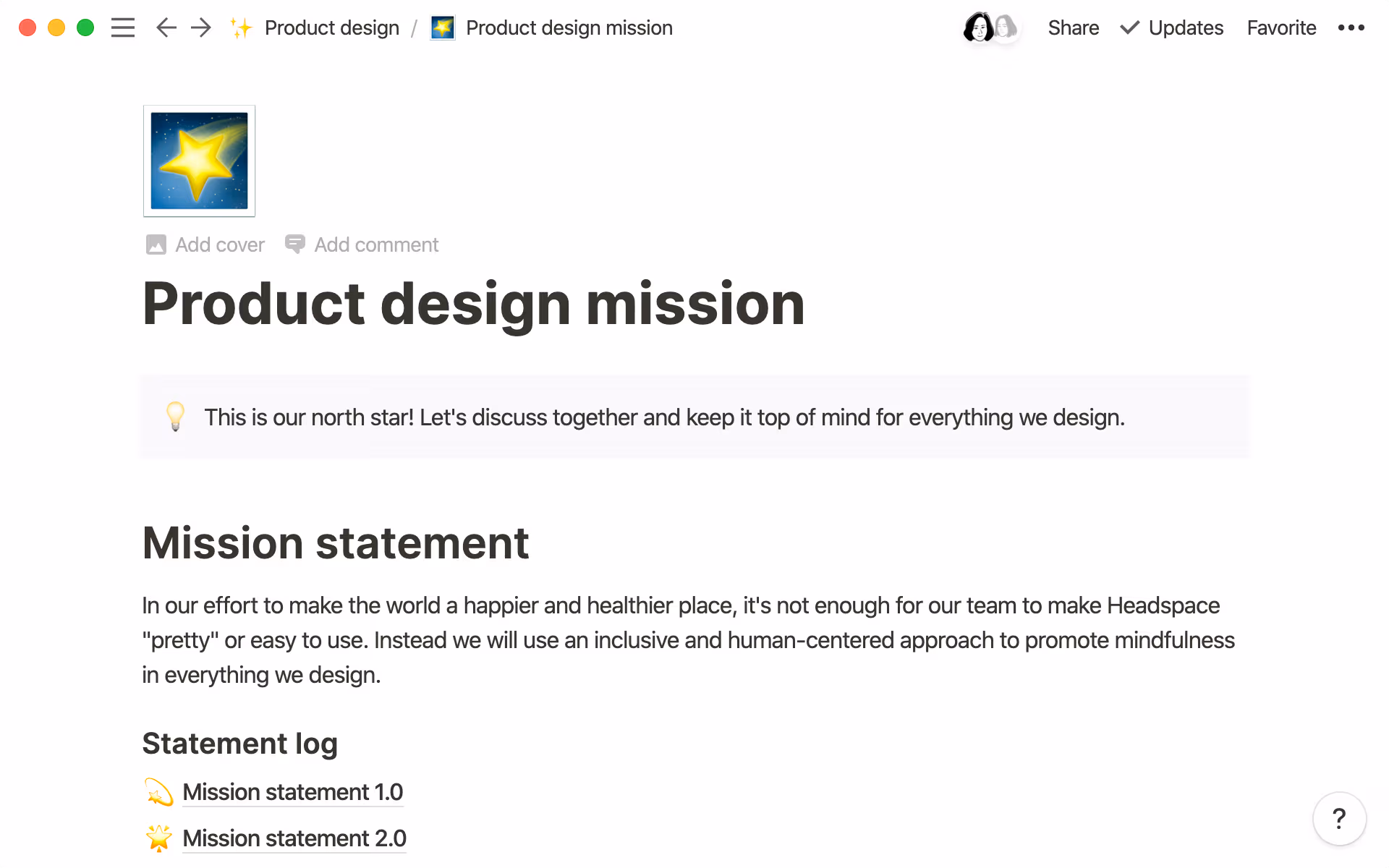 Headspace's product design mission lives and breathes in their daily workspace in Notion—not buried in a slide deck—where anyone can access it and discuss changes directly alongside the context, not in scattered Slack threads that break everyone's flow.